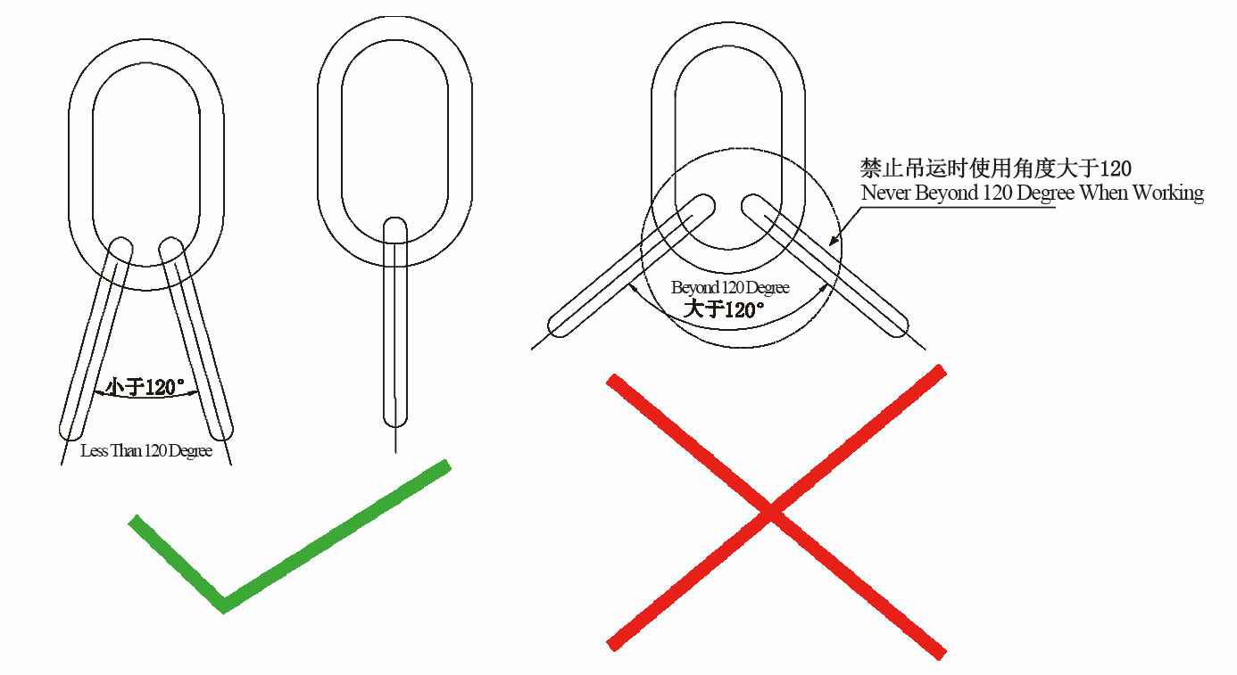 1.吊装作业时,最大允许使用角度为120度,使用角度如下图: